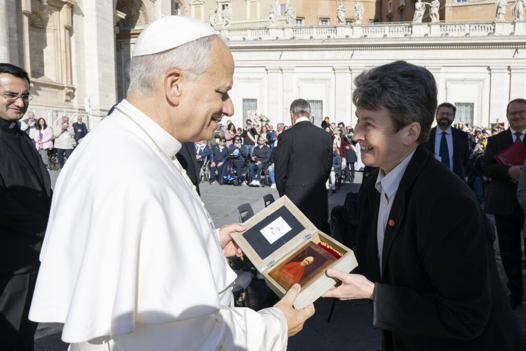 Le 8 novembre 2025, Sœur Christiane Fritsch FSO, secrétaire du Centre Newman et « speaker » lors de cette audience jubilaire, a offert au Saint-Père un portrait de Newman. La peinture à l’huile originale se trouve dans le couvent de l’église titulaire de Newman, San Giorgio in Velabro. Avec ce cadeau, elle a exprimé, au nom de la Famille spirituelle « L’Oeuvre » qui dirige le Centre Newman, sa gratitude pour la proclamation de saint John Henry Newman comme docteur de l’Église.